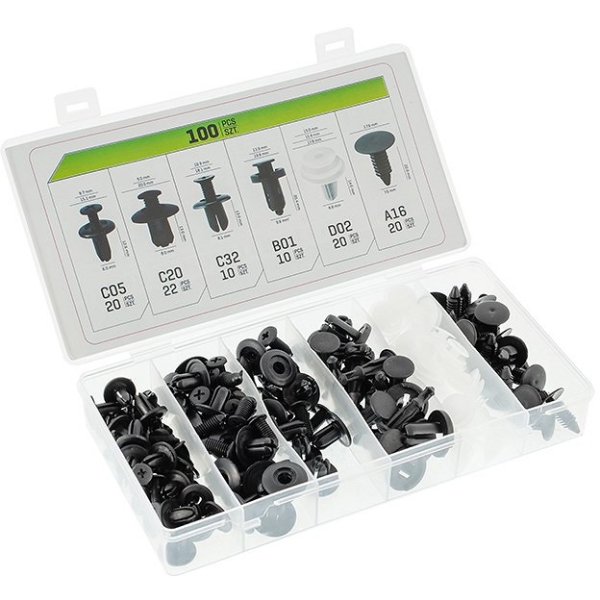 Komplekt sisaldab 6 enamlevinud tüübli tüüpi. Valmistatud tugevast ja vastupidavast plastikust. Kasutuskohad: auto sisustus, põrkerauad, rattakoopad, uste polstrid jne.