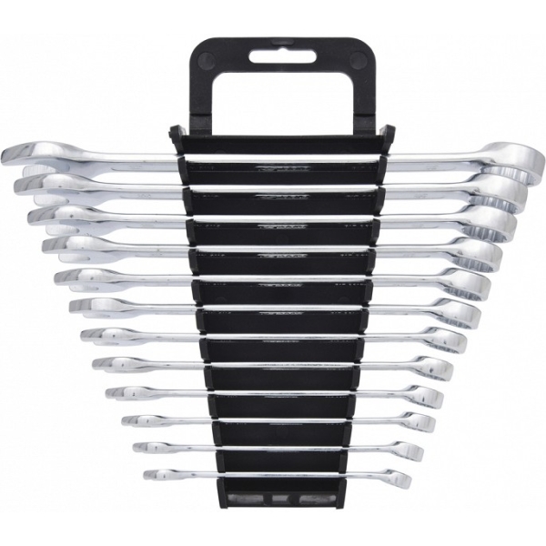 Klassikaline silmus-lehtvõtmete komplekt. 12-kant silmuse profiiliga. Silmuseosa on painutatud 15° nurga alla. DIN 3113.