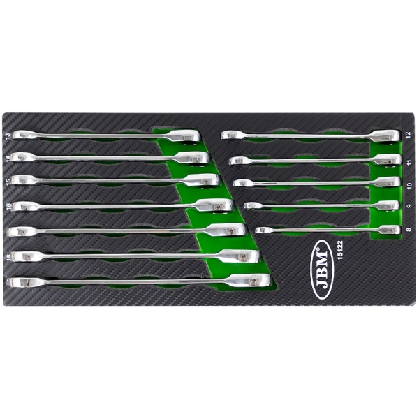 72H tirrmehhanismiga, poleeritud pinnatöötlusega silmus-lehtvõtmete komplekt. Pehmes, carbon-kattega foam-paneelis, soovi korral saab kasutada tööriistakäru sahtlis või tööriistakotis, tööriistakohvris. Foam-paneeli mõõdud 175×380 mm, paksus 30 mm.