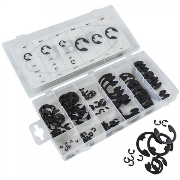 E-clip lukustus rõngasseibid. Enamlevinud mõõdud meetermõõt ja tollmõõt. Plastkarbis. 1.5 mm – 1/16″ (15 tk), 3 mm – 1/8″ (15 tk), 5 mm- 3/16″ (20 tk), 6 mm – 1/4″ (25 tk), 9 mm – 3/8″ (25 tk), 12 mm – 1/2″ (20 tk), 15 mm – 5/8″ (10 tk), 19 mm – 3/4″ (10 tk), 22 mm – 7/8″ (10 tk).