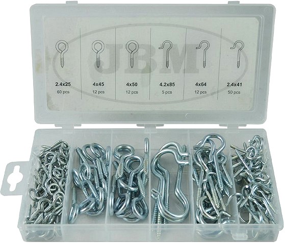Riputuskonksud ja riputussilmused. Komplektis mõõdud (silmused) 2,4×25-4×45-4×50 mm ja (konksud) 2,4×41-4×64-4,2×85 mm. Galvaaniliselt töödeldud.