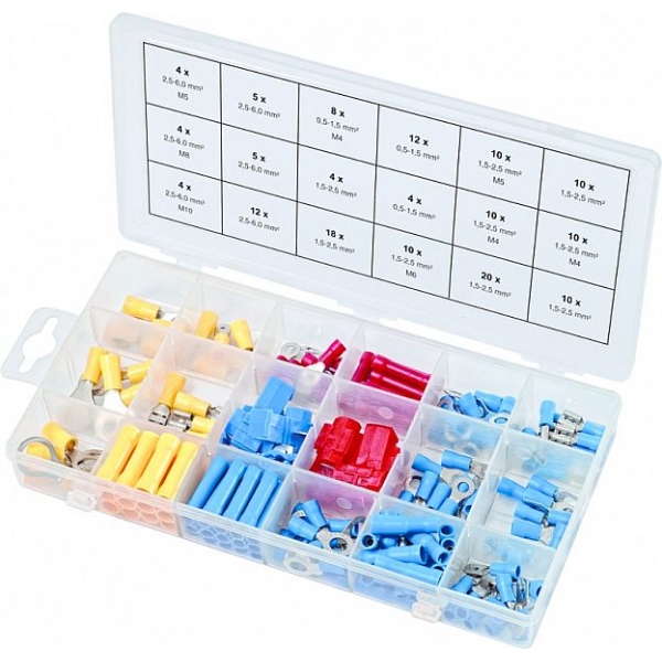 Sisaldab: 12 x 0,5-1,5mm, 18 x 1,5-2,5mm, 20 x 1,5-2,5mm, 12 x 2,5-6,0mm, 8 x 0,5-1,5 M4, 10 x 1,5-2,5 M4, 10 x 1,5-2,5 M5, 10 x 1,5-2,5 M6, 4 x 2,5-6,0 M5, 4 x 2,5-6,0 M8, 4 x 2,5-6,0 M10, 10 x 1,5-2,5mm, 5 x 2,5-6,0mm, 10 x 1,5-2,5mm, 5 x 2,5-6,0mm, 10 x 1,5-2,5 M4, 4 x 0,5-1,5mm, 4 x 1,5-2,5mm