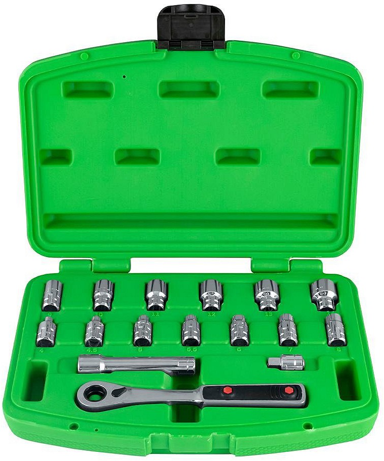 Läbiva avaga padrunite komplekt. Padruni+ tirrvõtme kõrgus vaid 25 mm. Kasutatakse rasketsi ligipääsetavades kohtades või kui poldi ots on pikaltüle mutri ning silmusvõtmega ligi ei pääse. Komplettis erinarre, mis asetub ümber padruni väliskrae. Padrunid valmistatud CrV eriterasest, käikuva pinnatöötlusega. Plastkohvris.