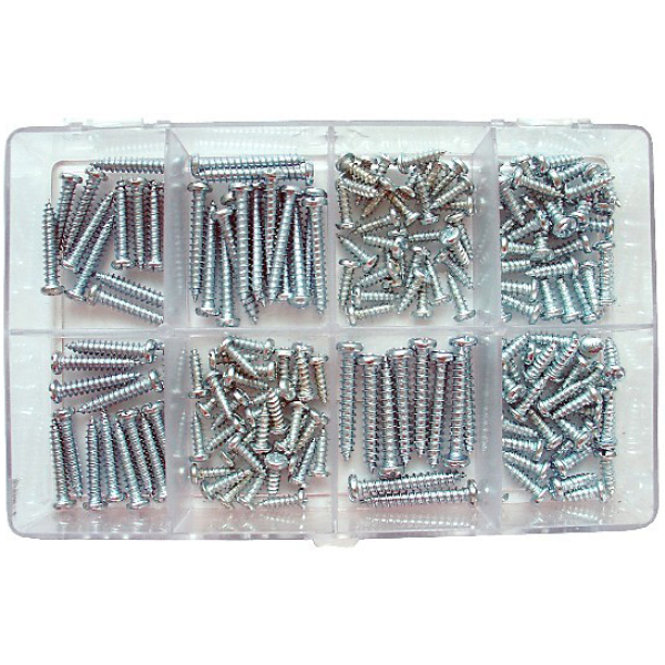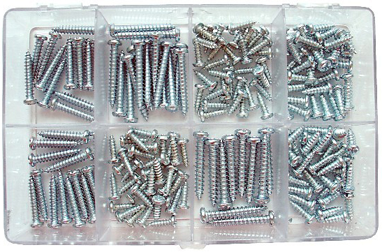 Komplektis kokku 5 erinevat mõõtu (175 tk) tsingitud ümarpeaga pleki/plastikruvi.