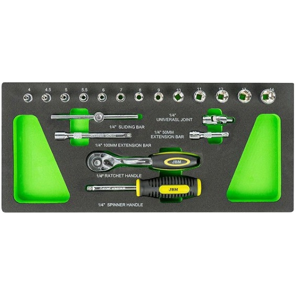Pehmes PU-paneelis 1/4″ padrunvõtmete ja tarvikute komplekt. Soovi korral saab kasutada tööriistakäru sahtlis, töölaua sahtlis, tööriistakotis või tööriistakohvris. Foam-paneeli mõõdud 175×380 mm, paksus 30 mm.