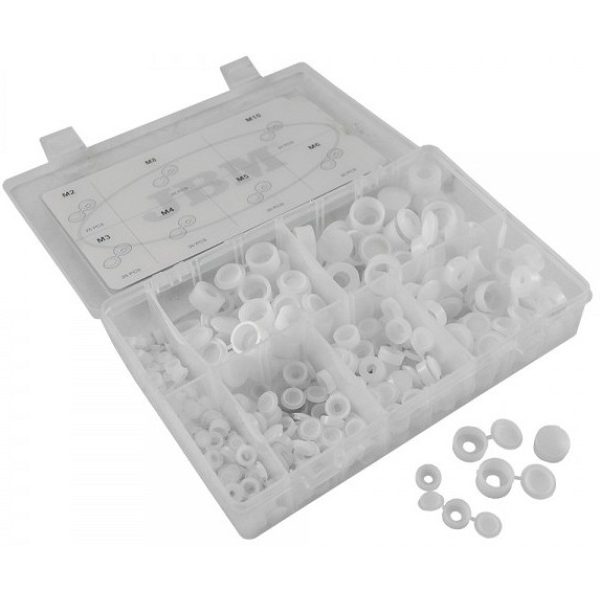 Plastkorgid, valged. UV-, keemia ja õlikindel plast. Komplektis mõõdud M3-M3-M4-M5-M6-M8-M10 mm.