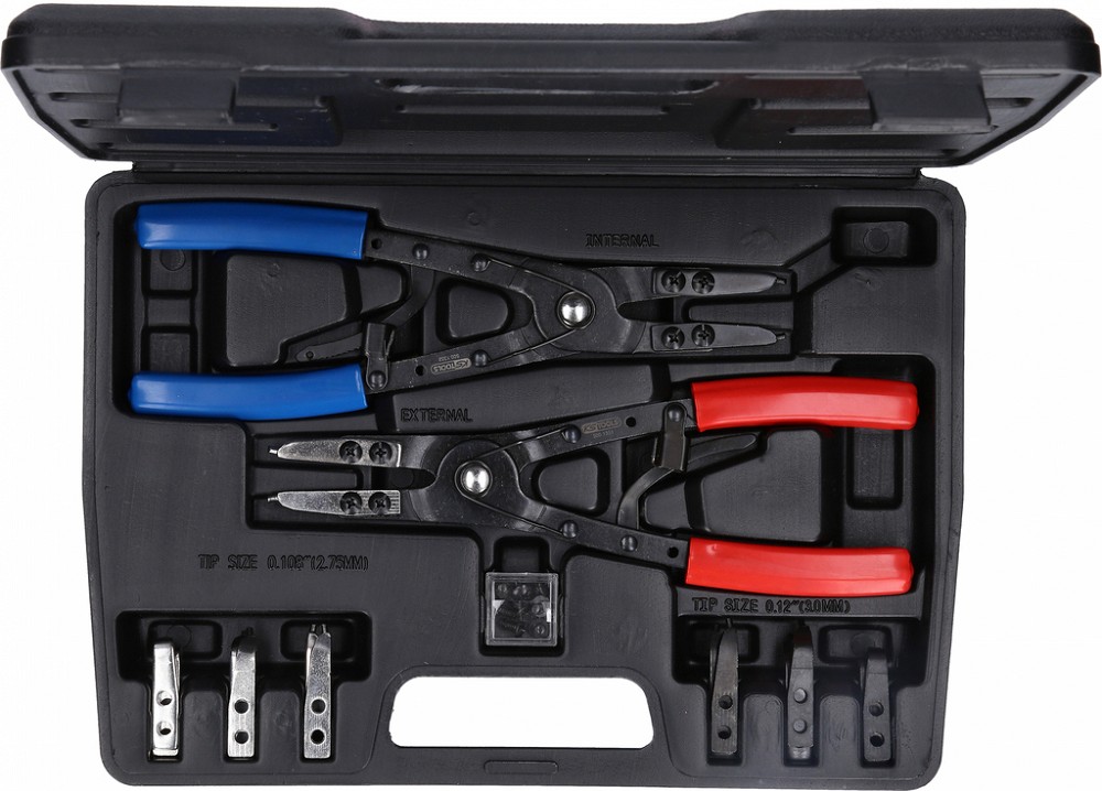 Lukustustirriga lukustusrõnga näpitsate komplekt. Vahetatavad otsad. Sise- ja välisrõngastele. Kummikattega pidemeosa. Kroom vanaadiumist. Siserõngastele mõõduga 60-100 mm, välirõngastele mõõduga 40-85 mm. Plastkarbis.