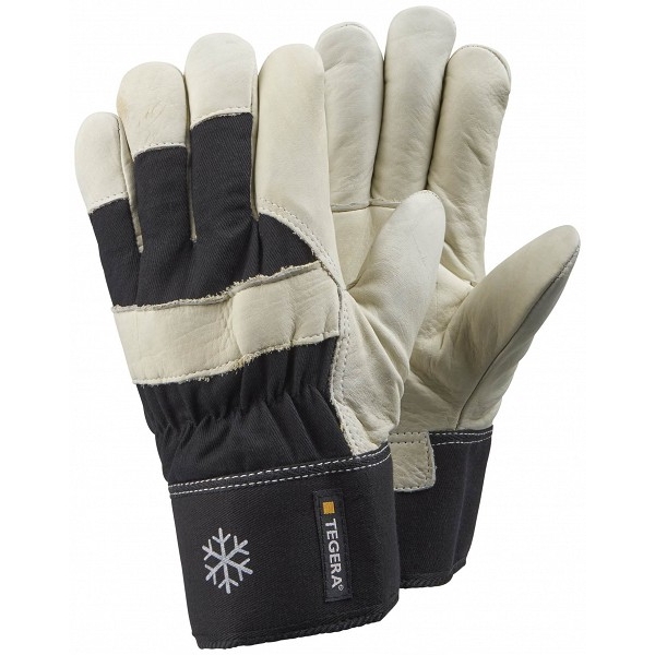 Nahkkinnas, talvevoodriga, veise pealisnahk, puuvill, fliis, Cat. II, beež, must, tugevdatud sõrmed ja pöial, randme kumminöör 180°, raske töö jaoks, EN 420:2003 + A1:2009, EN 511:2006, EU 2016/425