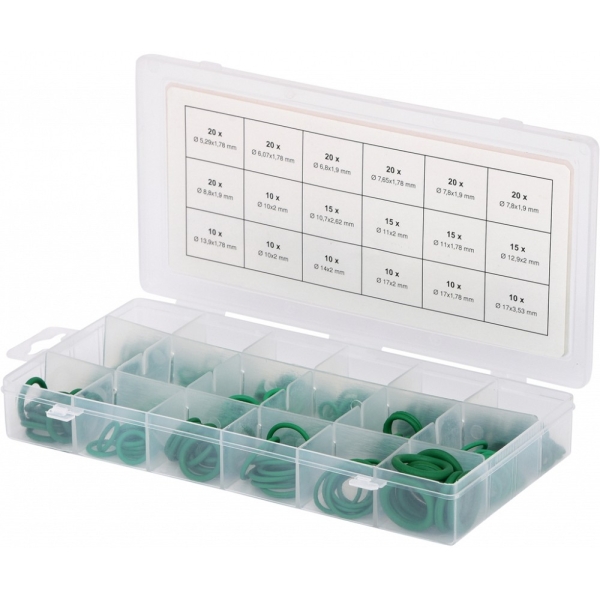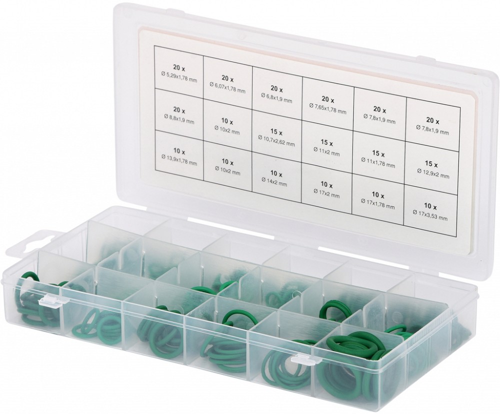 O-rõngad: 20×5,29×1,78 mm, 20×6,07×1,78, 20×6,80×1,90 mm, 20×7,65×1,78 mm, 40×7,80×1,90 mm, 20×8,80×1,90 mm, 20×10,00×2,00 mm, 15×10,70×2,62 mm, 15×11,00×2,00 mm, 15×11,00×1,78 mm, 15×12,90×2,00 mm, 10×13,90×1,78 mm, 10×14,00×2,00 mm, 10×17,00×1,78 mm, 10×17,00×2,00 mm, 10×17,00×3,53 mm.