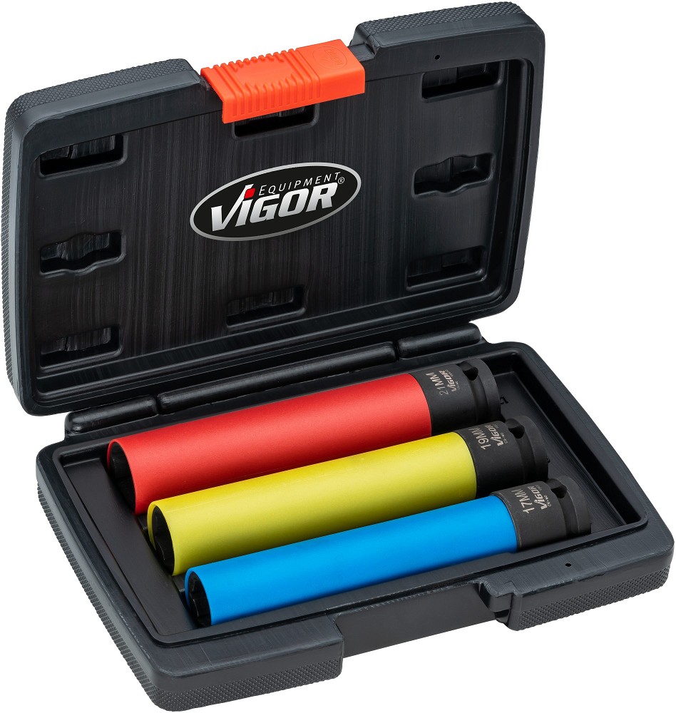 Plastkattega valuvelje löökpadrunite komplekt. Mõõdud 17-19-21 mm. Tänu 150 mm XL-pikkusele sobib kasutamiseks sügava poldiavaga-, PCD kattekaanega- ja racing velgedel. Populaarne toode rehvitöökodades ja autoesindustes. Valmistatud Cr-Mo eriterasest, fosfaaditud pinnatöötlusega. Padruni plastkatet saab vajadusel varuosana tellida. Plastkohvris.