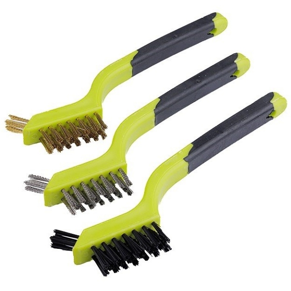 Plastist käepidemega käsiharjade komplekt – terashari, messinghari ja nailonhari kogupikkusega 180 mm.
