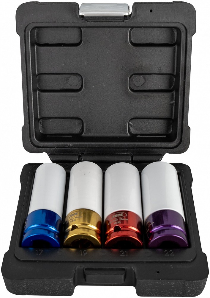 Hobikvaliteediga valuvelje löökpadrunid, plastkohvris. Komplektis mõõdud 17-19-21-22 mm. Padruni kogupikkus 85 mm. Kroom molübdeen eriterasest. Padrunid kaetud väljast plasthülsiga, vältimaks valuvelje poldiava värvikahjustusi.