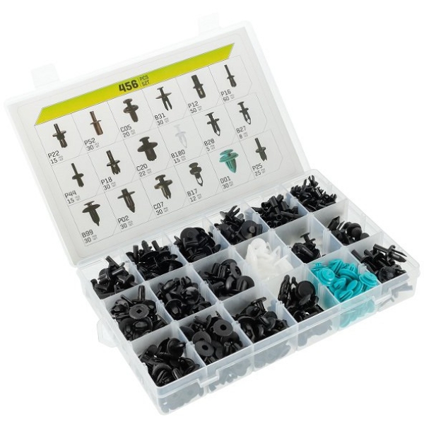 Komplekt sisaldab 18 enamlevinud tüübli tüüpi. Valmistatud tugevast ja vastupidavast plastikust, mis tagab pika kasutusea, olenemata ilmastikutingimustest. Kasutuskohad: auto sisustus, põrkerauad, rattakoopad, uste polstrid jne.