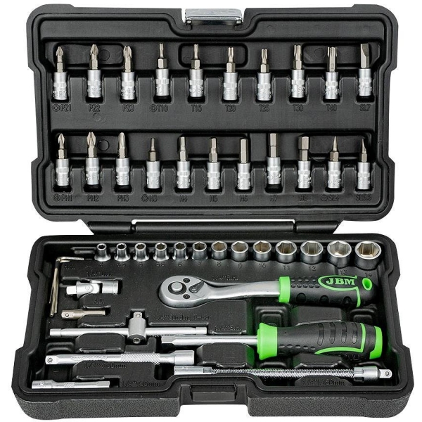 Korralik 1/4″ padrunite ja padrunotsikute komplekt. Võrreldes paljude teiste tootjatega, sisaldab JBM komplekt ka padrunite keeramise T-võtit. Tirrvõti 72H on offset-komposiitkäepidemega, mis kergendab selle kasutamist. CrV eriteras. Matt pinnatöötlus. Uue põlvkonna tugevas plastkohvris.