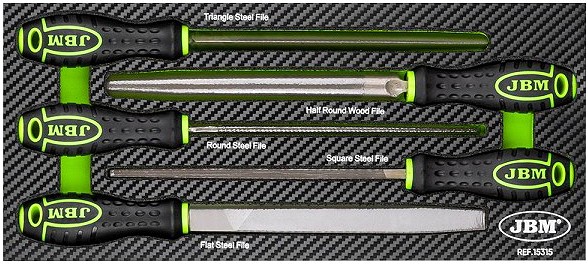 Viilide komplekt tööriistakärusse, lauasahtlisse jne. PU- paneelis. Sisaldab komposiitmaterjalist pidemeosaga ümarviil, kolmnurkviil, nelikantviil, lapikviil, poolümar viili. Pakutud korralikku pappkarpi.