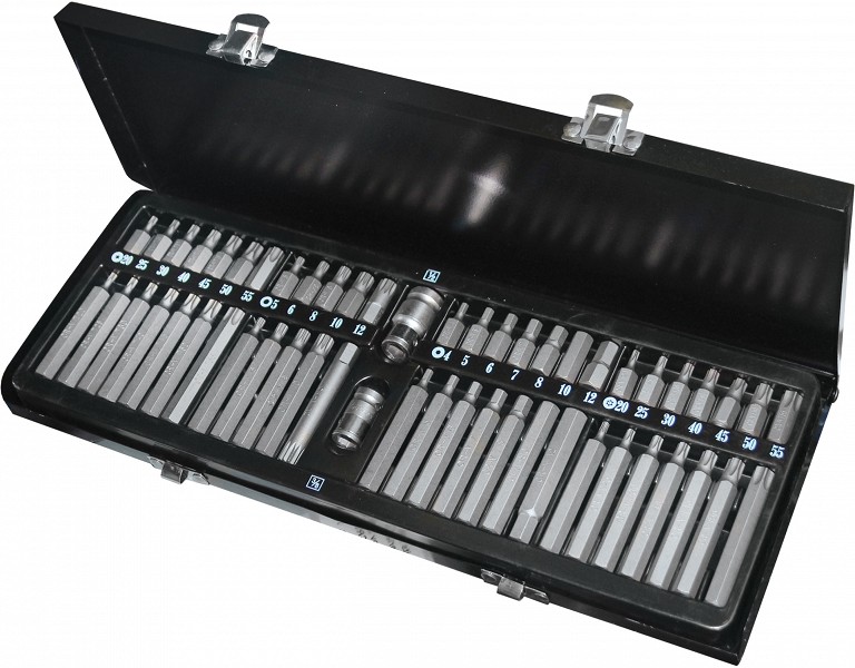 Valmistatud vastupidavast CrVan terasest. Metallkarbis. 10 mm kuuskanttapiga otsikud.