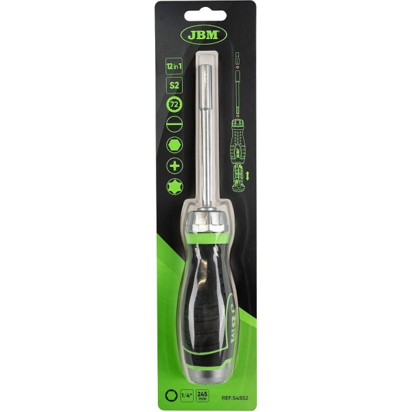 Komposiitkäepidemega universaalne kruvikeeraja. Tirrmehhanismiga tagamaks kiire ja lihtne töö. Vahetatavate keeramisotsikutega, S2 eriterasest. Otsikud asuvad pidemeosa sisse ehitatud kambris. Sisaldab mõõdud: ristotsikud PH1-PH2-PH3, lapikotsikud 4-5-6 mm, torx otsikud T15-T20-T25, kuuskant otsikud 3-4-5 mm. Kruvikeeraja kogupikkus 245 mm.
