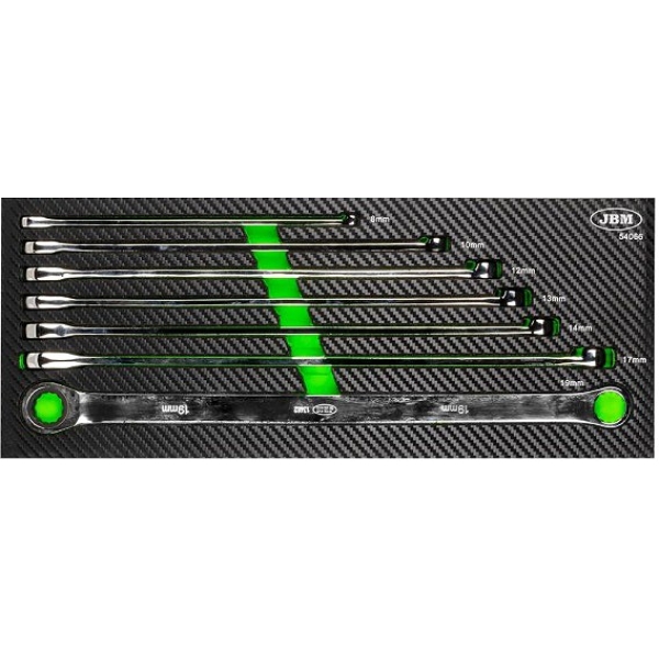 Suurepärane komplekt XL-pikkadest silmusvõtmetest. Võtme ühes otsas on 72H tirrmehhanismiga silmus ja teises sama mõõtu tavaline 12-kant silmus, millega saab teosatada avamise esimese momendi ning lõpp-pingutuse. Komplektis mõõdud 8-10-12-13-14-17-19 mm. Valmistatud vastupidavast kroomvanaadium eriterasest. Kroomitud pinnatöötlus. Pehmes PU-paneelis, mis pakitud pappkarpi.