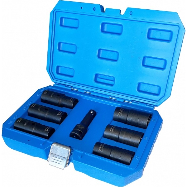 Väga õhukese seinaga kahepoolsed padrunid ilma plastkatteta! Kahepoolsed padrunid: 17,5 x 22,5 / 20,5 x 21,5 / 18,5 x 19,5. Väljakeeramisabinõud jämeda/tiheda vastupidi keermega spiraaliga: 17/19mm, 19/21mm, 21/22mm. Lisaks 1/2″ löök-pikendusotsik kahepoolsete padrunite keeramiseks.