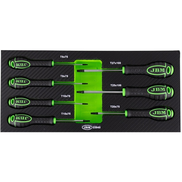 Pehmes PU-paneelis Torx kruvikeerajad. Soovi korral saab kasutada tööriistakäru sahtlis, töölaua sahtlis, tööriistakotis või tööriistakohvris. Foam-paneeli mõõdud 175×380 mm, paksus 30 mm.