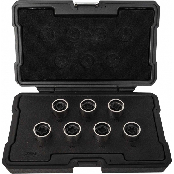 JBM 7-osaline kapslite komplekt on mõeldud McGard-tüüpi vargapoltide ja vargamutrite eemaldamiseks Opel ning Stellantis kontserni sõidukitel. Komplekt sisaldab lillekujulise tähikuga kapsleid, mis sobivad originaalsete lukustuspoltide avamiseks.