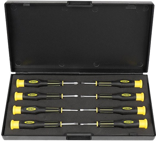 Minikruvikeerajate komplekt, pöördpeaga. Sisaldab rist- ja lapikkruvikeerajaid. Komposiit peaosaga. Fosfaaditud otsaga. Plastkarbis.