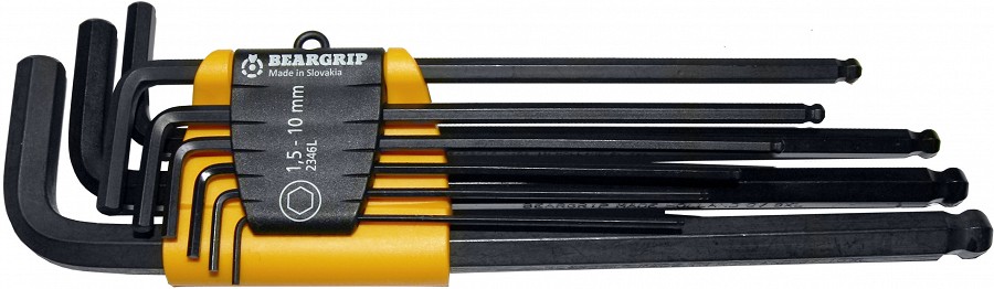 Kuulotsaga L-kuuskantvõtmed, võimalik poldipead keerata nurga all. Valmistatud CrV eriterasest, fosfaaditud pinnatöötlus. Plasthoidikus. Valmistatud Slovakkias.