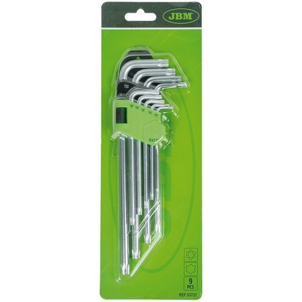 Pikkade L-Torx võtmete komplekt, avaga. 90-218 mm pikkused. Kroomvanaadium eriterasest. Plastikhoidikus.