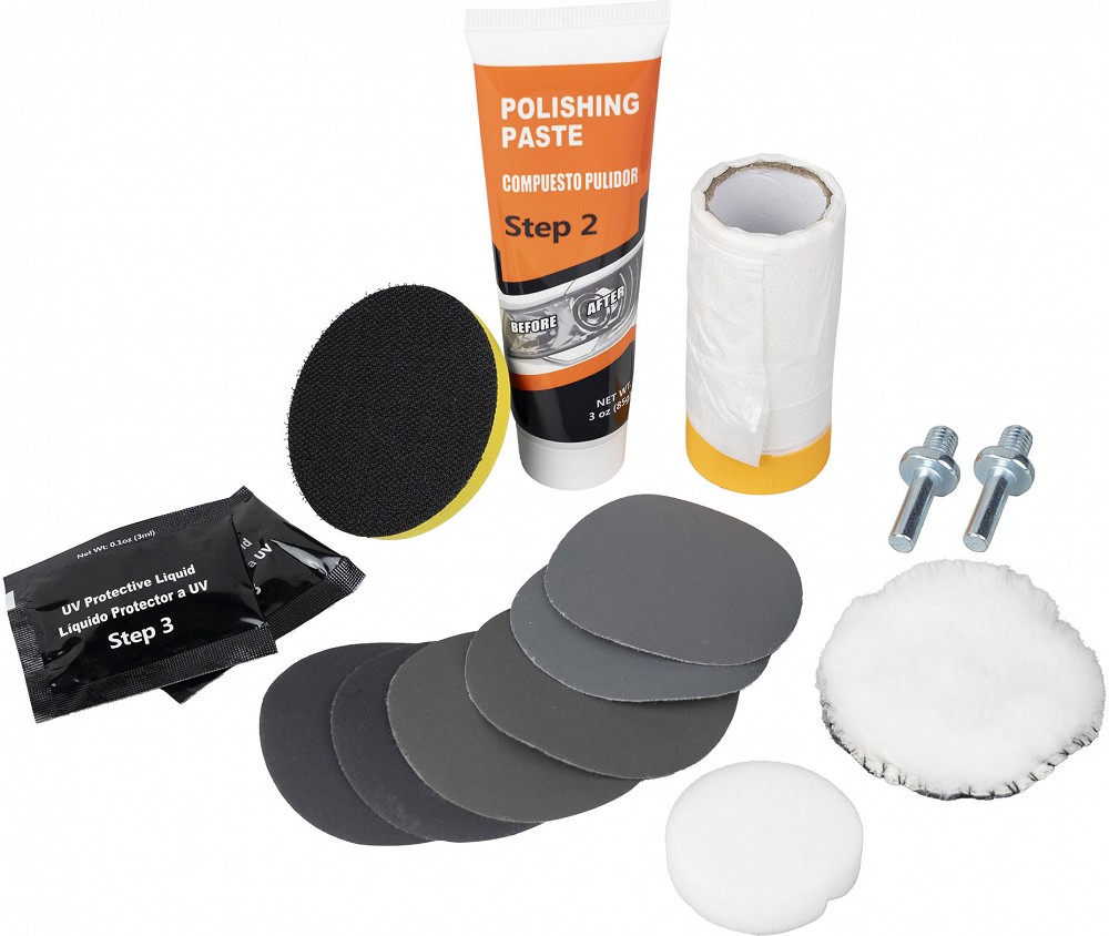 Universaalne poleermise padjakeste ja pasta komplekt, mille abil saab taastada esitulede esialgse läike ja läbipaistvuse. Komplektis abrasiivpadjad P800x2, P1200x2, P2000x2 ja poleeraine, UV-kaitse vedelik, poleerpadjad, katteteip jne.