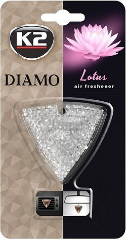 K2 DIAMO õhuvärskendaja on dekoratiivse vääriskivi välimusega õhuvärskendaja, muudab autosalongi välimuse ainulaadseks ja prestiižseks. Sisaldab lõhnaainega immutatud graanuleid, mis on pikaajalise toimega ja tagavad aroomi ühtlase jaotumise. Õhuvärskendaja kinnitatakse auto ventilatsiooniava ribide külge komplektis sisalduva spetsiaalse klambriga või riputuskummi abil peegli külge.