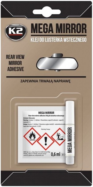 K2 MEGA MIRROR on kahekomponentne tahavaatepeegli liim. Sellega saab liimida ka metalli metalliga ja klaasi klaasiga. Samuti keraamikat, plastikut ja muid kõvasid ja siledaid pindu. Selle tugevus on 3000 psi. Selle suurepärane tõhusus on tingitud uuest ülitõhusast aktivaatorist. Tahavaatepeegli liimimiseks kulub 15 minuti ja täielikult kivistub 24 tunniga.