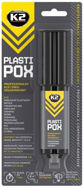 Professionaalne kahekomponentne epoksiidliim igat tüüpi pindade liimimiseks, eriti plastiku. Liimi uuenduslik koostis tagab liidete kvaliteedi ja vastupidavuse. K2 Plastipoxi plastide liimühendused jäävad nii tugevad nagu oleksid need kokku keevitatud. Sobib järgmiste materjalide liimimiseks: plastik, puit, metall, roostevaba teras, klaas, keraamika, portselan, klaaskiud, PVC, ABS, nahk, puit jpt. Saab edukalt kasutada autoplastide liimina. Kahekomponendiline plastliim K2 Plastipox omab suurt löögikindlust ning on vee, bensiini, petrooleumi ja õlikindel. Täidab ideaalselt kuni 10 mm paksused õõnsused. Liim hakkab tahkuma 7 minuti pärast. Liimitud eset saab liigutada 15 minuti, 2 tunni pärast on liide saavutanud 75% oma tugevusest ja 24 tunni pärast on see täielikult kõvastunud. Värv – piimjas. Madalamal temperatuuril võib kuivamisaeg olla pikem. Täielikult ühendatud liide peab vastu: -55°C kuni +120°C temperatuurile. Liite survetugevus on kuni 305 kg/cm2. K2 Plastipoxi uuenduslik süstla-aplikaator tagab mõlema komponendi hõlpsa kasutamise ja optimaalse doseerimise korraga. Suletud süstal kaitseb toodet kuivamise eest, tänu millele säilitab liim oma omadused kaua pärast avamist ega lase sellel kuivada. Toode ei sobi PE-polüetüleenist ja PP-polüpropüleenist valmistatud plastikute liimimiseks. Kui otsite tugevat plastiliimi, plastist keevisliimi või autotööstuse plastliimi, siis olete selle leidnud. K2 Plastipox ühendab pinnad lõplikult.
