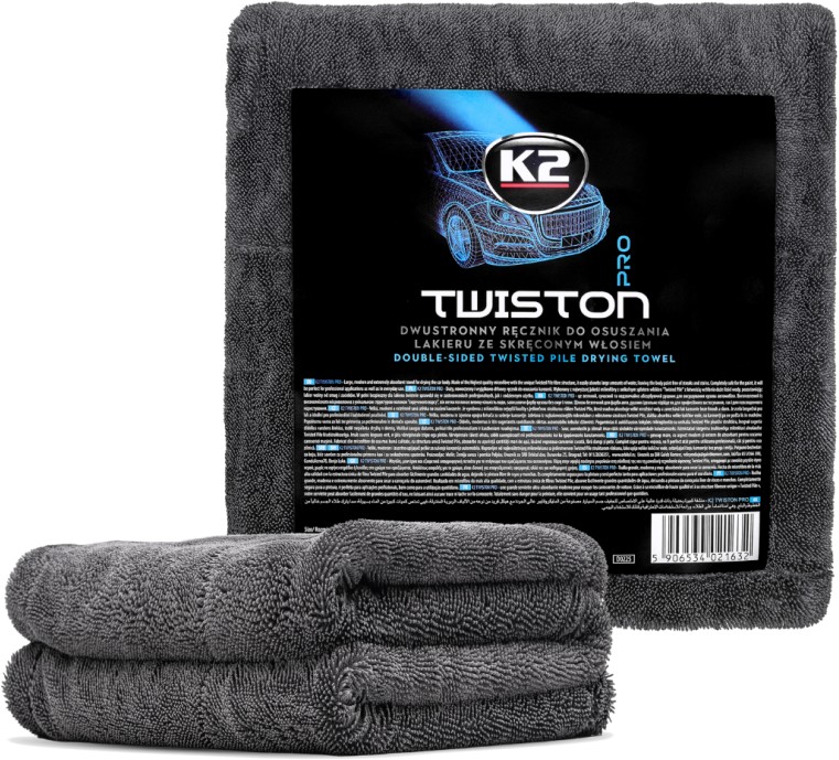 K2 TWISTON PRO on suur, kahepoolne ja ülimalt imav autokuivatuslapp kõige nõudlikumale kasutajale. Kahepoolse lapina pakub K2 TWISTON PRO teie sõiduki kuivatamisel ületamatut tõhusust ja mugavust. Valmistatud kõrgeima kvaliteediga mikrokiust, ainulaadse “Twisted Pile” kudumisega ehk “keerutatud harjastega”, imab vett tornaado jõuga, jättes kuivataud pinnad triibuvabaks. Tänu oma suurele kaalule 1200 gsm ja suurtele mõõtmetele 60×90 cm suudab see kuivatuslapp kergesti kuivatada ka kõige suuremaid pindu, tagades kiire ja tõhusa tulemuse. Keeratud kiud tagavad sujuva libisemise üle kere, minimeerides kriimustuste riski ja tagades ohutuse ka kõige õrnematel pindadel. K2 TWISTON PRO on autokuivatusrätik, mis sobib suurepäraselt nii igapäevaseks kui professionaalseks kasutamiseks. Rätiku pind on jagatud põikõmblustega osadeks, tänu millele ei lähe rätik lõhki.