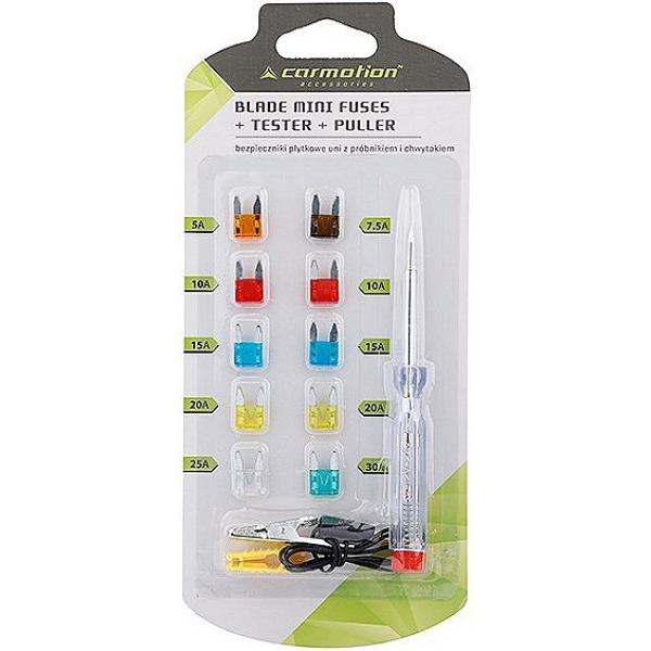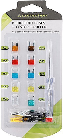 Klassikaline mini-kahvelkaitsmete komplekt, millele lisaks on komplektis nõelindikaator ja kaitsme väljatõmbamise abivahend. Sobib elektrisüsteemidele 6-24 V.