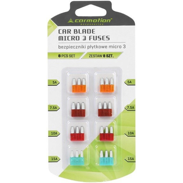 Micro 3 kahvelkaitsmete komplekt, mida kasutatakse elektriliste ahelate kaitsmiseks ülekoormuse eest. Sõltuvalt vooluringist kasutatakse erineva võimsusega kaitsmeid. Kaitsmed sobivad kasutamiseks sõiduautodes, kaubikutes ja veoautodes.