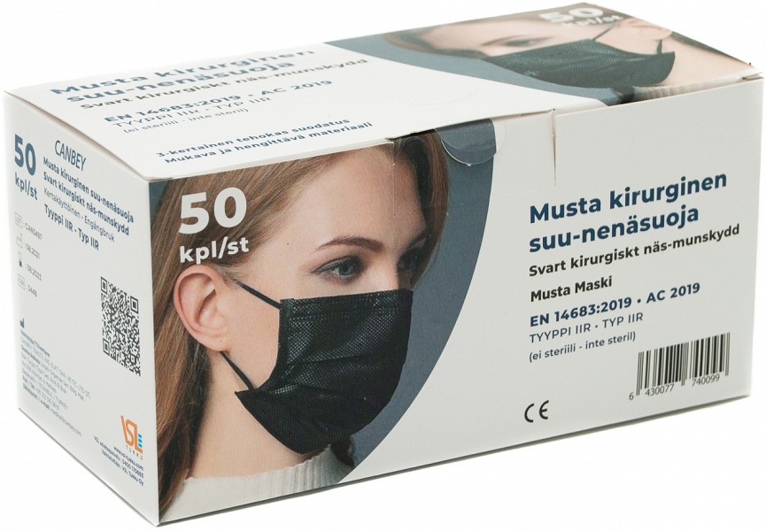 Kolmekihiline musta värvi kaitsemask, mille sisemine kiht on valmistatud erimeetodil. Mask ei eralda ebemeid ega ka kangakiude, sellest tulenevalt ei ärrita nahka ega ninasõõrmeid. Maski sees alumiiniumist ninaklamber, mida kerge nina kuju järgi seada. Kõrva ümber minevad kummist aasad sobivad noortele ja täiskasvanutele, samas aasade pingsus ei ole kõrvu ega näopinda rõhuv. Sobib kasutamiseks ka mõnepäevase habemega. Maski mõõt 175×95 mm. Karbis 50 maski, mis pakitud 10 kaupa kilepakkidesse. Filtreerimise efektiivsus BFE>98%. Vastab normidele EN 1486:2019, AC:2019. Valmistatud Türgis.