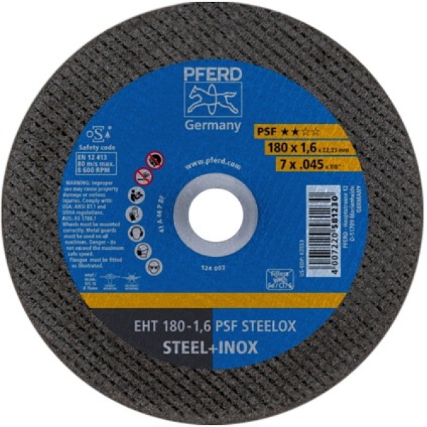 PFERD PSF STEELOX lõikeketas lehtmetalli, profiilmetalli, torude, avade ja süvendite jm lõikamiseks. Tugevdatud, “perfomance” ketas. Sobib erinevate teraste ja ka roostevabade teraste lõikamiseks. Kõrge efektiivsusega lõikeketas tänu suurele lõikejõudlusele ja seejuures pikale elueale. Suure lõikejõudlusega, valmistatud spetsiaalsest corundum segust (raua-, sulfaatide- ja kloriidivaba).