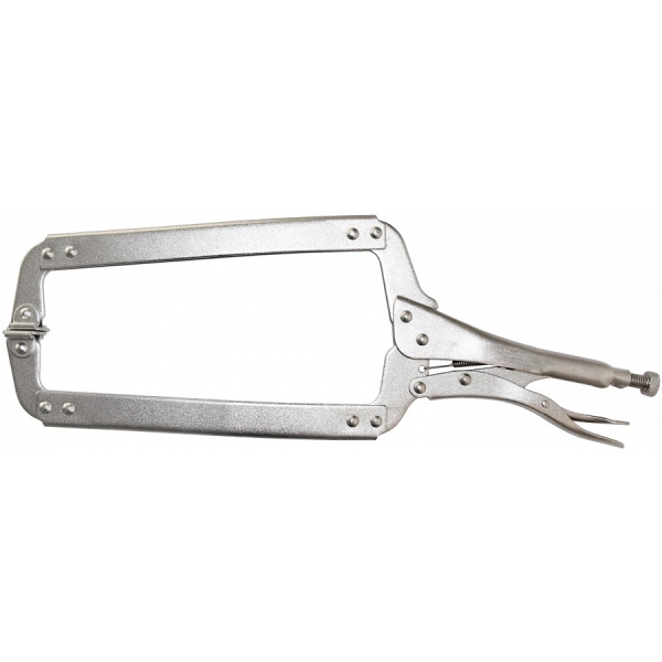 Sügava C-lõuaga lukustatavad plekksepa tangid. Nikkelkattega. Erikarastusega. Haara otsas liikuv plaatots.