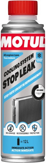 Motul Cooling System Stop Leak on tõhus jahutussüsteemi lekkepeataja, mis sobib kasutamiseks kõikides bensiini- ja diiselmootorites. Lisand toimib kiiresti ning hõlpsalt kõikides suletud vedelikjahutusega süsteemides, peatades väiksed lekked radiaatoris ja muudes jahutussüsteemi komponentides.