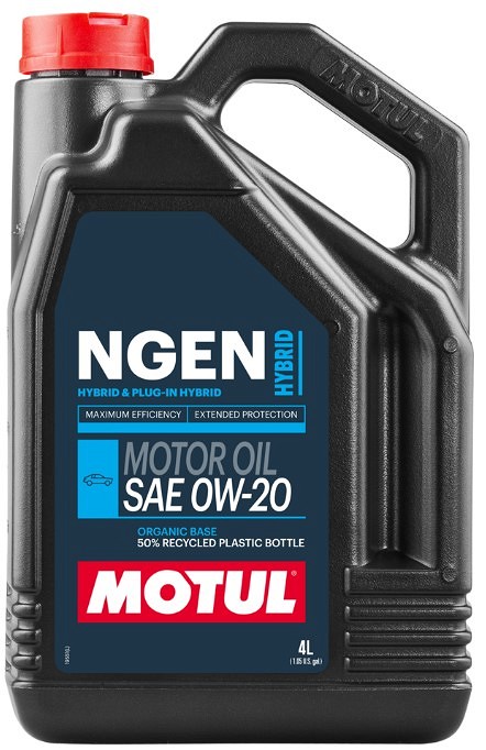 Sünteetiline bioallikaga kütusesäästlik mootoriõli, mis on spetsiaalselt loodud hübriididele. Sobib kasutamiseks hübriid-(H.E.V) ja pistikhübriid- (P.H.E.V) sõidukitele, mis on varustatud bensiini-, turbo või vabalthingava mootoriga ja milles on ette nähtud kasutada SAE 0W-20 mootoriõli. Õli on spetsiaalselt loodud tehniliste väljakutsete jaoks, näiteks suur START/STOP taaskäivituste arv ja madalamad õlitemperatuurid. MOTUL NGEN HYBRID 0W-20 sobib ka akuga elektrisõidukitele (B.E.V), mis on varustatud bensiinimootoriga, mida kasutatakse sõiduulatuse pikendajana. Ühildub katalüüsmuundurite ja tahkete osakeste filtritega. Toote tipptasemel koostis on osa täiesti uuest Motuli säästvast kontseptsioonist, kuna sisaldab 25% ulatuses orgaanilist baasõli (100% taastuv taimne sünteetiline baas), millele on lisatud 50% ulatuses ümbertöödeldud õli. Õli on pakendatud 100% taaskasutatavast plastist kanistrisse, vähendades kahjulikku keskkonnamõju ning võimaldab vähendada tootmisel süsiniku jalajälge 25% võrra.