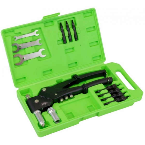 Suurepärane multitoode – 360° pöördpeaga popup needitangid, millega saab lisaks neetidele paigaldada ka hülssmutreid. Needi mõõdud 2,4-3,2-4,0-4,8 mm, hülssneedid keermega M3-M4-M5-M6. Tugevas plastkohvris.