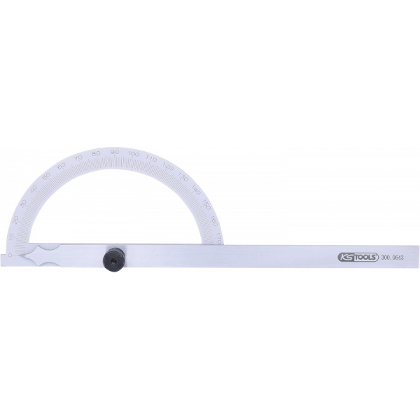Osutiga, mõõteulatus 0-180°. Lukustuskruviga. Roostevabast terasest, mõõteskaala graveeritud, värvitud numbritega.