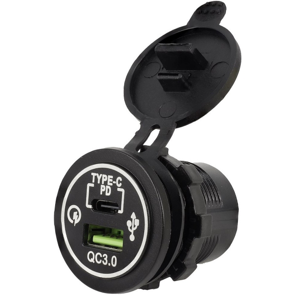 USB laadija sõidukitele, mis töötavad 12/24 V alalisvooluga. 1 x QC 3.0 USB-port (max 18 W) ja USB-C PD-port (max 30 W). Sobib 30 mm avasse. Soovitatav on ühendada läbi 15 A kaitsme. Sinise taustavalgusega. Juhtme pikkus 60 cm.